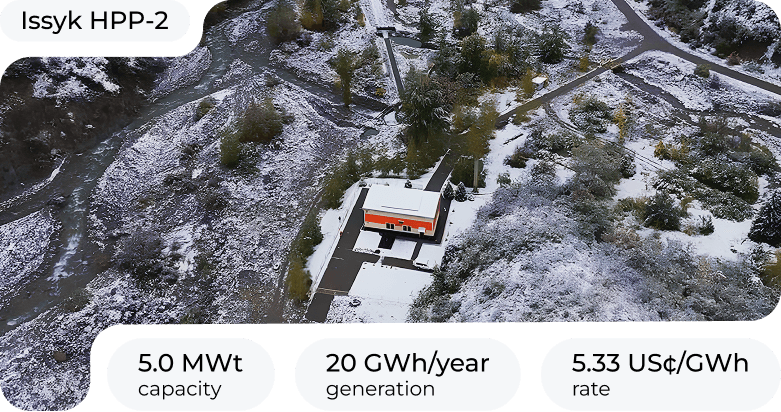 The Issyk Small HPP-2 on the Issyk River was commissioned in 2016. Installed capacity: 5 MW. Annual generation: about 20 million kWh of environmentally friendly electricity.